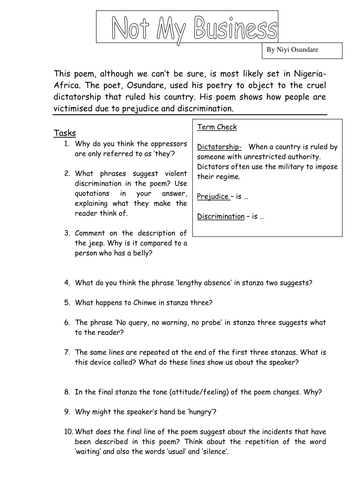 Not My Business Niyi Osundare Poetry Teaching Resources